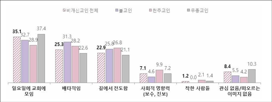 특히 기독교 하면 떠오르는 이미지를 묻는 질문에 대한 답으로 응답자들은 '일요일에 교회에 모임(35.1%)', '배타적임(25.3%)', '길에서 전도함(22.9%)'의 순으로 답변했다.