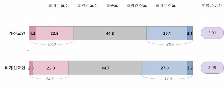 주관적 정치 성향을 물은 결과, 개신교인은 ‘보수(매우+약간)’ 27.0%, ‘중도’ 44.8%, ‘진보(매우+약간)’ 28.2%로 응답됐으며, 비개신교인은 ‘보수(매우+약간)’ 24.3%, ‘중도’ 44.7%, ‘진보(매우+약간)’ 31.0%로 응답됐다. 개신교인의 경우 비개신교인과 비교하여 이념적 보수나 진보의 차이는 크게 나지 않았다.
