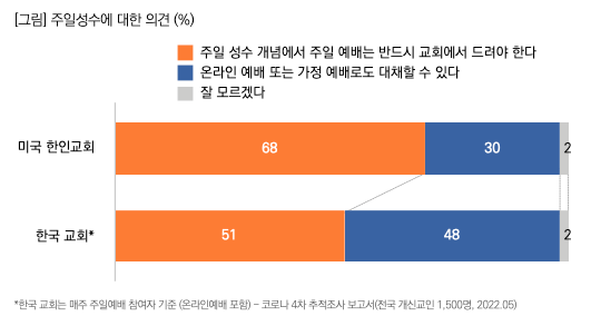 주일성수에 대해 질문한 결과, '주일예배는 반드시 교회에서 드려야 한다'는 응답이 68%로 나와 한국 교회(51%)보다 높게 나타났다. 목회데이터연구소는 "미국 한인교회 교인들의 경우 한국 교회보다 온라인 예배에 대한 수용도가 낮아 한국 교회보다 더 전통적이고 보수적인 특징을 보여주고 있다"라고 분석했다.