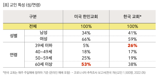 미국 한인교회와 한국 교회 교인들의 연령별 분포에 따르면, 한국 교회는 60세 이상 교인이 38%다. 반면, 미국 한인교회는 60세 이상이 53%로 나타나 미국 한인교회가 더 고령화 상태인 것으로 나타났다.