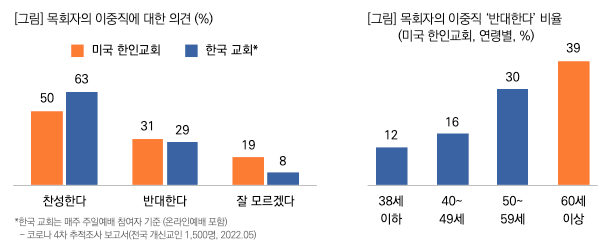 반면, 목회자 이중직에 대한 의견은 한국 교회보다 찬성율이 낮게 나왔다. 미국 한인교회 교인들은 목회자의 이중직에 대해 ‘찬성한다’는 의견이 50%였고, ‘반대한다’는 의견은 31%로 찬성비율이 더 높았다. 목회데이터연구소는 "이중직을 반대하는 의견은 연령이 높을수록 많았는데, 이는 세대 간에 이중직에 대한 의견 차이가 크게 갈리고 있음을 보여준다"라고 분석했다.