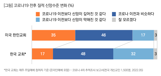 코로나19 전후 신앙생활의 질적 변화를 측정한 결과, 미국 한인교회 교인의 35%가 '코로나 이전보다 신앙이 깊어진 것 같다'고 응답했다. 이 결과는 한국 교회(17%)보다 높게 나타난 것으로써 코로나 이후 한국 교회보다 신앙의 깊이가 더욱 깊어진 것으로 나타났다.