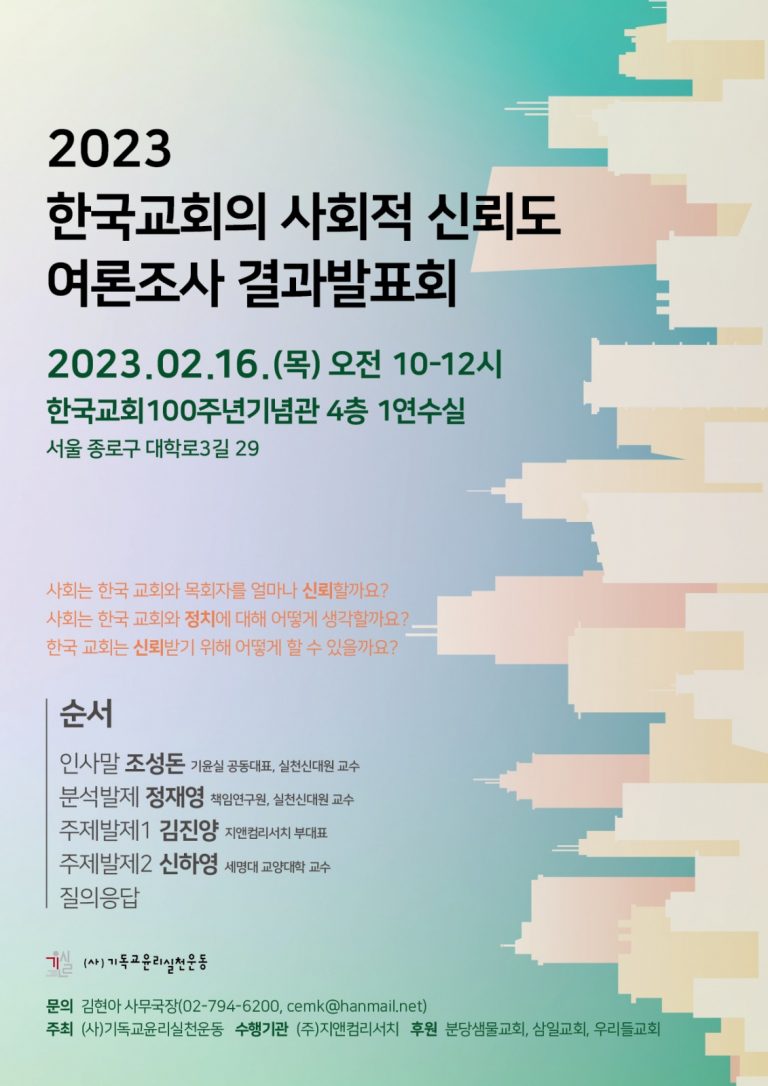 한편, 기윤실은 오는 2월 16일(목) 오전 10시 한국교회100주년기념관 4층 1연수실에서 '2023년 한국 교회의 사회적 신뢰도 여론조사 결과 발표회'를 갖고 보다 자세한 결과를 발표할 예정이다.