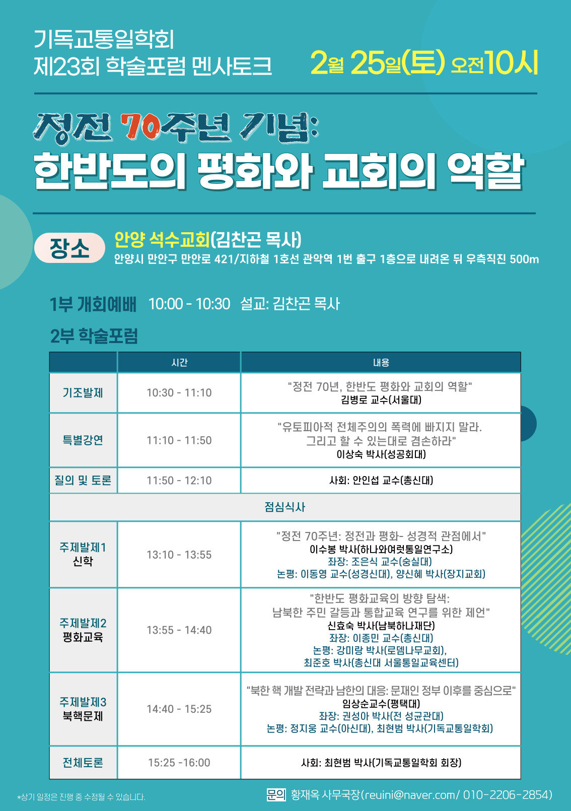 이번 학술포럼은 <정전 70주년 기념:한반도의 평화와 교회의 역할>을 주제로 열린다.