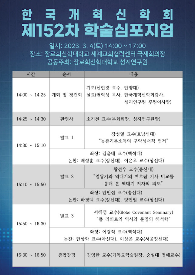 한국개혁신학회(회장:소기천 박사/장신대 교수)가 장신대 성지연구원과 공동으로 오는 3월 4일 오후 2시 장신대 세계교회협력센터 국제회의장에서 <제152차 학술심포지엄>을 개최한다.