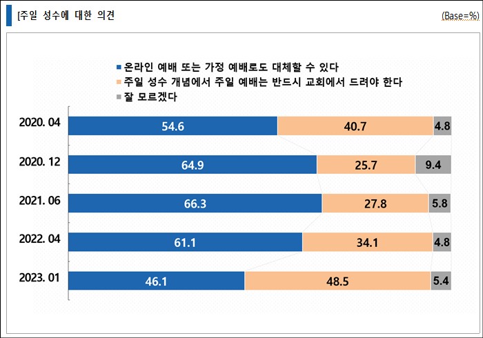 특히 개신교인에게 주일 성수에 대한 의견을 물은 결과, 48.5%는 '주일예배는 반드시 교회에서 드려야 한다'고 응답했으며, 46.1%는 '온라인 예배 또는 가정 예배로도 대체할 수 있다'고 응답했다. 즉, 현재 주일 성수와 관련해서 '현장예배'와 '온라인예배'에 대한 양측 의견은 여전히 팽팽한 상태인 것이다.