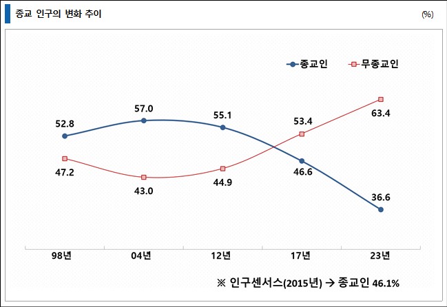2023년 한국사회 무종교인은 63.4%로 나타났으며, 종교별 분석 결과 개신교인은 지속적인 감소 속에 15.0%까지 하락한 것으로 조사됐다.