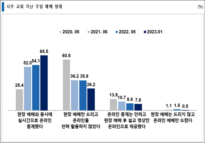 이 결과는 현재 한국 교회의 예배 형태가 오프라인과 온라인을 병행하는 '하이브리드 형식의 예배'로 자리 잡아가고 있다고 보여주고 있다.