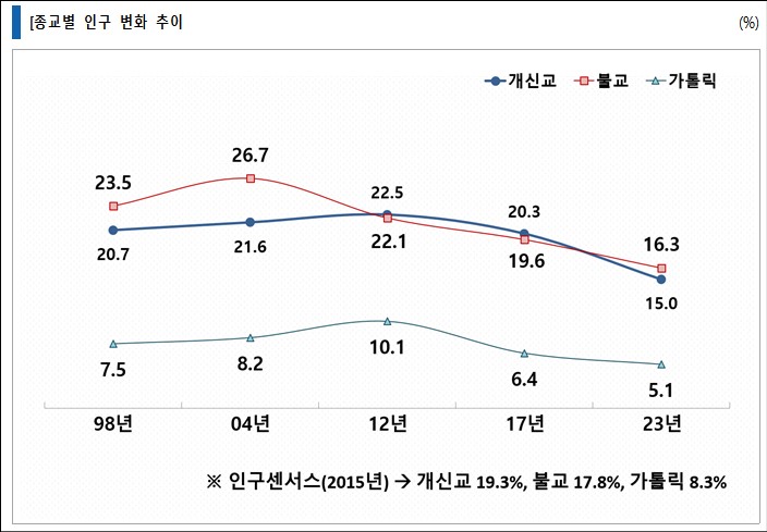종교별 분석 결과, 개신교는 15.0%, 불교 16.3%, 가톨릭 5.1%로 나타났으며, 개신교가 15.0%까지 감소한 것으로 조사됐다. 지난 2012년을 기점으로 국내 주요 3대 종교가 꾸준하게 감소세를 보이는 실정이다.