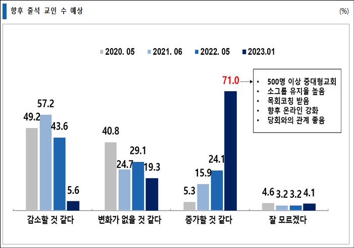 목회자를 대상으로 향후 출석 교인 수를 물은 결과, '증가할 것 같다'가 71.0%로 담임목사들은 향후 출석 교인 예상에서 낙관적인 전망을 하고 있는 것으로 파악됐다.