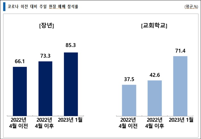 현재 장년 교인 예배 참석률은 85.3%였으며, 교회학교 학생들의 예배 출석률은 71.4%로 나타났다. 특히 교회학교의 현장 예배 참석률이 직전 조사 대비 28.8%p의 상대적으로 높은 상승 폭을 보였다.