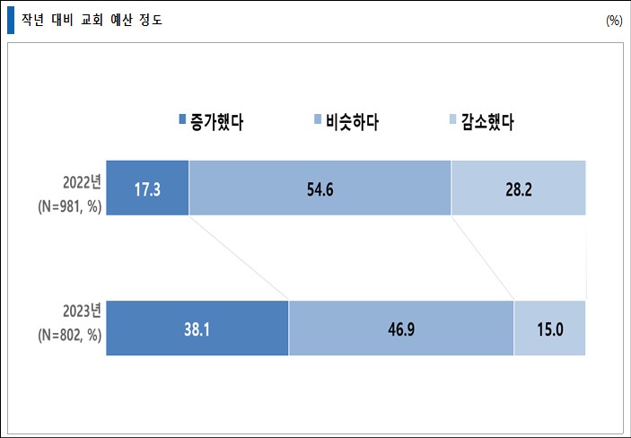 현장 예배 참석율이 높아지고, 교회의 전반적인 사역도 전반적으로 조금씩 상승하고 있는 결과, 작년 대비 교회 예산도 증가한 것으로 나타났다.