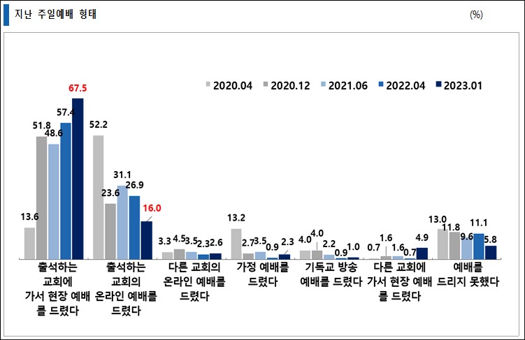 교회 출석자를 대상으로 조사한 결과, 지난 주일에 예배를 드린 형태는 '출석교회 현장 예배'가 67.5%로 지난 2022년 4월 57.4%에서 크게 상승한 것으로 나타났다. 이외에 '출석교회 온라인 예배' 16.0%, '다른 교회 온라인 예배' 2.6% 등의 순으로 나타나는 등 전체적으로 '출석교회 온라인 예배'는 2021년 6월을 기점으로 감소하는 추세에 있는 것으로 파악됐다.