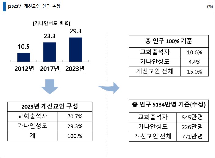 하지만 교회출석자 70.7%, 가나안 성도 29.3%를 고려한다면, 현재 교회출석자는 545만 명, 가나안 성도는 226만 명으로 개신교인 인구를 파악할 수 있다. 무엇보다 개신교인은 총인구 대비 감소하는 반면에 가나안 성도들의 비율은 계속해서 증가하고 있음을 볼 수 있어, 이에 대한 대책 마련이 시급한 상황이다.
