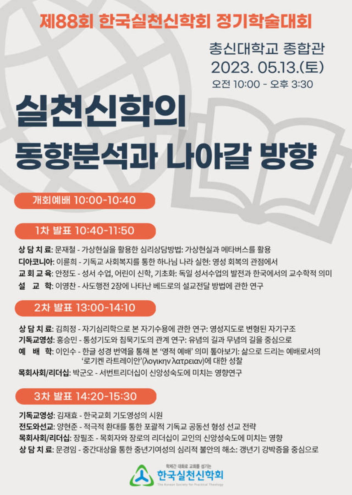 한국실천신학회(회장:서승룡 박사, 새전주중앙교회)가 오는 5월 13일(토) 오전 10시 총신대 종합관에서 제88회 정기학술대회를 개최한다.