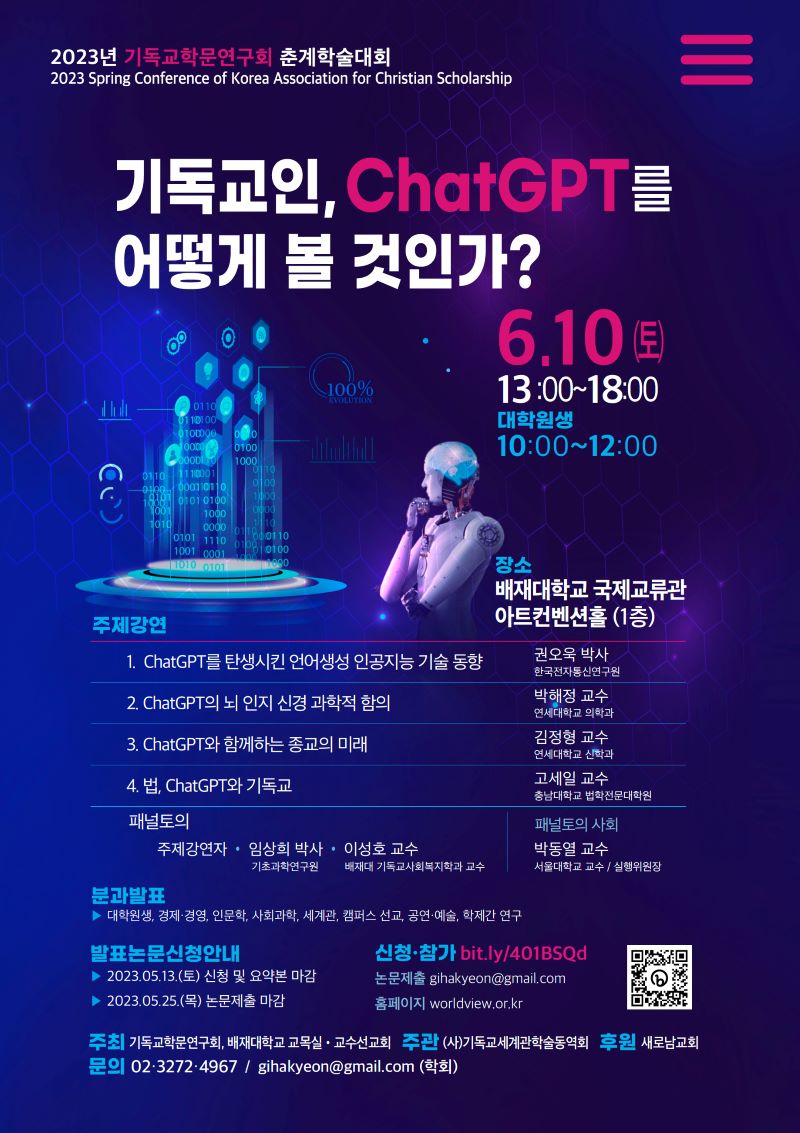 <기독교인, ChatGPT를 어떻게 볼 것인가?>를 주제로 진행되는 이번 학술대회는 권오욱 박사(한국전자통신연구원)를 비롯해 박해정 박사(연세대 의학과 교수), 김정형 박사(연세대 신학과 교수), 고세일 박사(충남대 법학전문대학원 교수) 등이 주제강연자로 참여해 △ChatGPT를 탄생시킨 언어생성 인공지능 기술 둥향 △ChatGPT의 뇌 인지 신경과학적 함의 △ChatGPT와 함께 하는 종교의 미래 △법, ChatGPT와 기독교 등을 주제로 발표한다.