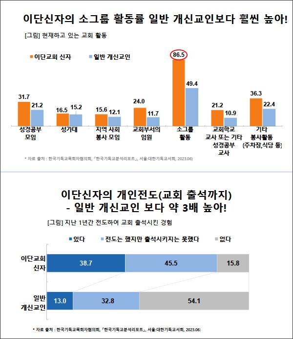 또한 이단신자의 소그룹 활동률도 86.5%로 개신교인 49.4%보다 매우 높은 것으로 파악됐다.