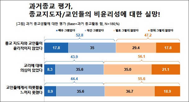 무엇보다 이단 신자들의 52.8%는 과거 종교 지도자와 교인들의 비윤리성에 대해 큰 실망을 한 것으로 파악됐다.