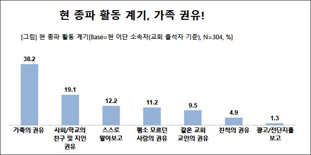 또한 처음 활동 시작은 ‘가족의 권유’(38.2%) 영향이 가장 컸다. 이단 신자 3명 중 2명은 ‘같은 종파에 속한 가족이나 친척이
