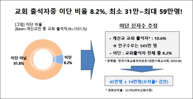 2023년 한국 교회 출석자 중 8.2%가 이단으로 예상된다는 조사결과가 나왔다. 이를 인구수로 추정한다면 한국 교회 안에 31만 명에서 59만 명의 이단 신자가 있다는 분석이다.