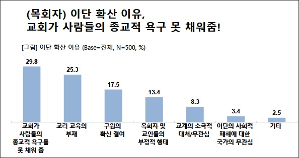 특히 목회자들은 이단 확산 이유로 ‘교회가 사람들의 종교적 욕구를 채워주지 못함’(29.8%)과 ‘교리 교육의 부재’(25.3%)를 가장 많이 꼽았다.