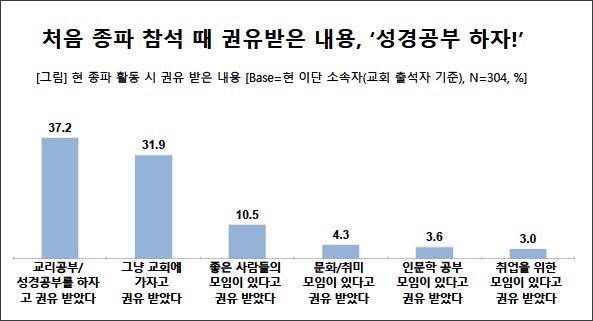 또한 종파 활동 시 권유받은 내용으로는 '교리공부/성경공부 권유'가 37.2%, '그냥 교회에 가자고 권유'가 31.9%로, 성경공부나 단순 교회 출석을 제안하는 형태의 권유가 많았다.