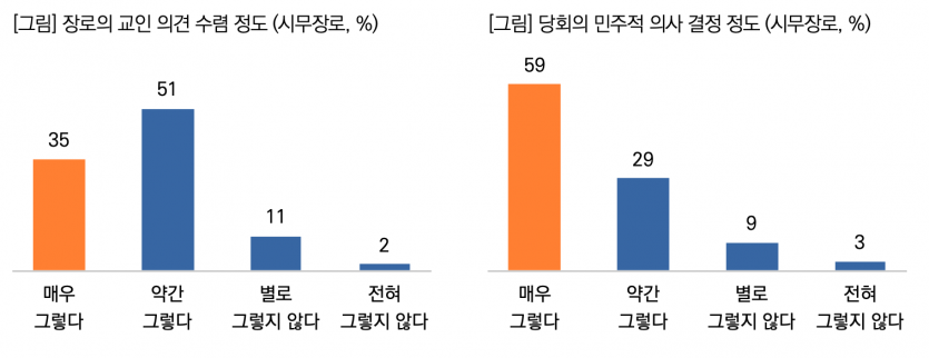 조사 결과, ‘장로들이 전체 교인의 의견을 잘 반영해서 교회 정책을 결정한다’의 ‘매우 그렇다’ 비율은 35%로 ‘교회 당회가 민주적으로 의사 결정을 한다’의 59%보다 낮게 나타났다. 즉 시무장로 3명 중 1명 정도만이 교인의 의견을 적극적으로 수렴하고 있었다.