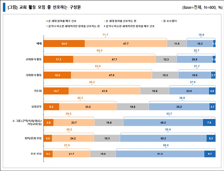 교회 활동을 할 때 온 세대 참여를 선호하는 모임은 ‘예배’가 71.7%로 가장 높은 응답률을 보였고, 그 다음은 ‘교회 봉사 활동’ 65.0%, ‘사회 봉사 활동’ 63.0%, ‘기도회’ 56.2% 등의 순으로 나타났다.