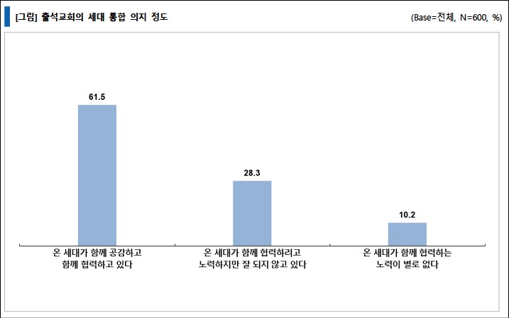 출석교회의 세대 통합 의지 정도에 대해 질문한 결과, '온 세대가 함께 공감하고 함께 협력하고 있다'는 응답이 61.5%로 가장 많았고, 그 다음은 '온 세대가 함께 협력하려고 노력하지만 잘되지 않고 있다' 28.3%, '온 세대가 함께 협력하는 노력이 별로 없다' 10.2% 순으로 많은 교회가 온 세대 통합을 위해 노력하고 있는 것으로 인식하고 있었다.