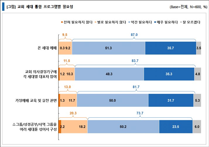 온세대 통합을 위한 프로그램 및 활동의 필요성에 대한 생각을 물은 결과, '온 세대 예배'가 87.0%로 가장 응답률이 높았고, 그다음은 '교회 의사결정기구에 각세대별 대표자 참여'가 83.7%, '가정예배 교육 및 실천 권면' 81.7%, '소그룹/성경공부/사역 그룹을 여러 세대를 섞어서 구성'이 73.7% 등의 순이었다.