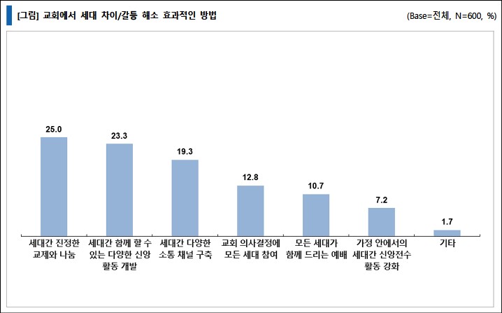 교회에서 세대 차이 및 갈등을 해소하는 효과적인 방법에 대해 질문한 결과, 4명 가운데 1명이 ‘세대 간 진정 한 교제와 나눔’(25.0%)을 가장 많이 꼽았다. 그다음으로 ‘세대 간 함께 할 수 있는 다양한 신앙 활동 개발’이 23.3%, ‘세대 간 다양한 소통 채널 구축’ 19.3%이었다. 그 외에 ‘교회 의사 결정에 모든 세대 참여’ 12.8%, ‘모든 세대가 함께 드리는 예배’ 10.7% 등도 효과적인 방법으로 응답했다.