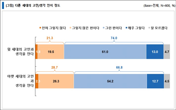 다른 세대의 고민과 생각을 이해하려고 노력하는지에 대해 질문한 결과, '노력한다'는 응답이 72.7%, '노력하지 않는다'는 응답이 27.3%로 '노력한다'는 응답이 3배 가까이 높게 나타났다. '노력한다'는 응답이 세대별로 차이가 있는데, 40대 이하는 60%대, 50대와 60대는 80%대로 큰 차이를 보였다. 즉 50~60세대는 스스로 자신들이 다른 세대(주로 아랫 세대)를 이해하려고 노력한다고 자부하고 있는 것으로 나타났다.