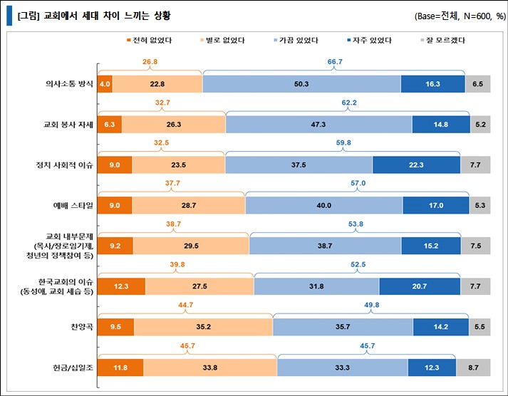 세대 차이를 느낀다는 응답률이 가장 높은 항목은 ‘의사소통 방식’(66.7%)이었고, 그다음은 ‘교회 봉사 자세’(62.2%)였다. 즉 이슈 그 자체보다는 그것에 대한 상호 의사소통 방식의 문제가 세대 차이를 느끼게 하는 가장 큰 요소인 것으로 나타났다.