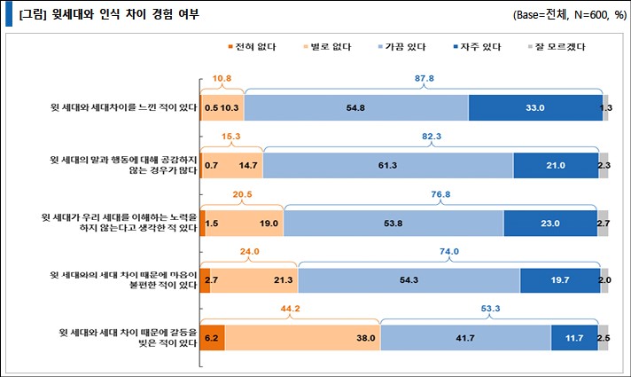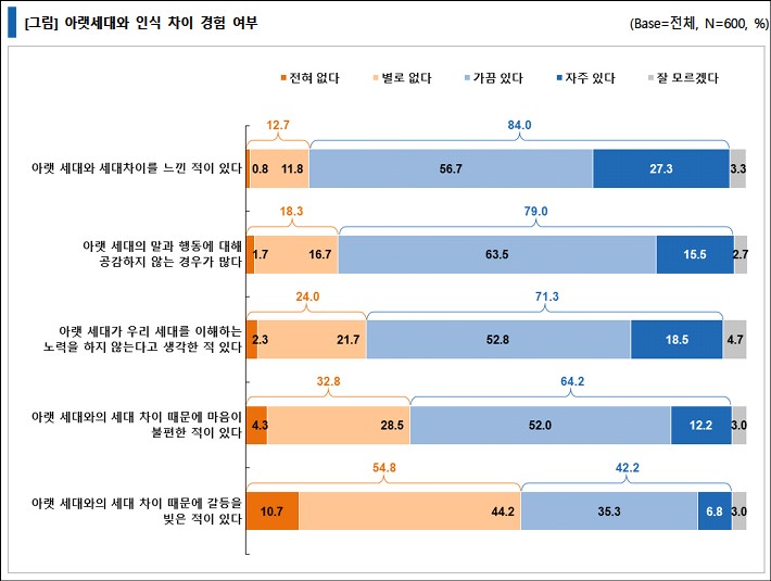 반대로 이랫세대와의 인식 차이 경험에 대해 질문한 결과, '아랫 세대와 세대 차이를 느낀 적 있다'는 응답이 84.0% 로 매우 높았다. '아랫 세대의 말과 행동에 공감하지 않는 경우'는 79.0%였으며, '아랫 세대가 우리 세대를 이해하는 노력을 하지 않는다'는 응답이 80%대였다.