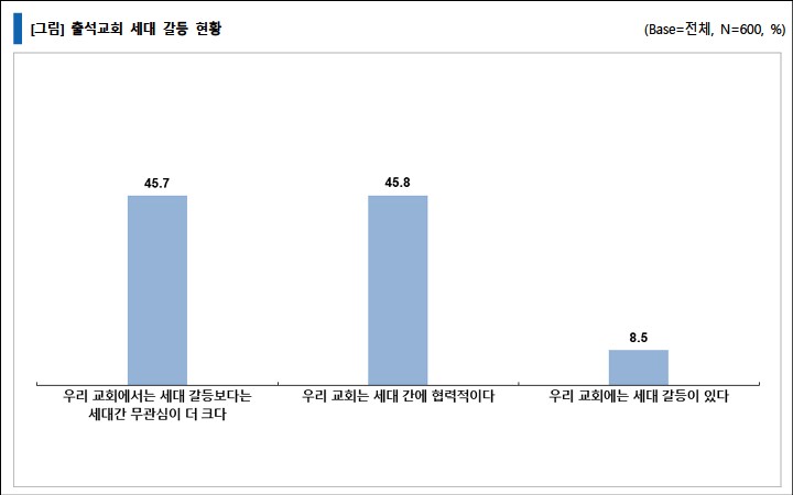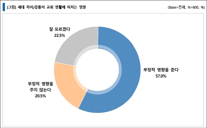 세대 차이와 갈등이 교회 생활에 어떤 영향을 미친다고 생각하는지 질문한 결과, ‘부정적 영향을 준다’고 생각하는 이들은 57.0%로 응답자의 절반 이상이었다. ‘부정적 영향을 주지 않는다‘는 의견은 20.5%로 '부정적 영향을 준다'의 절반 이하로서 응답자들은 세대 차이와 갈등이 미치는 부정적 영향을 심각하게 보고 있다고 할 수 있다.
