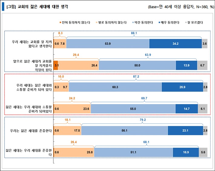 40대 이상 응답자들에게 젊은 세대에 대한 생각을 물은 결과, ‘우리 세대는 교회를 잘 지켜왔다고 생각한다’ 고 88.1%가 응답하여 자부심을 나타냈다. 자부심이 큰 만큼 ‘앞으로 젊은 세대가 교회를 잘 지켜줄지 걱정이 된다’는 응답은 63.9%였다.