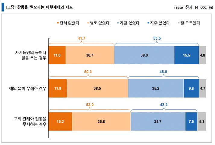 반대로 아래 세대로부터 마음이 힘들거나 갈등을 느꼈는지 질문한 결과, 아랫세대가 ‘자기들만의 용어나 말을 쓰는 경우’라는 응답이 53.5%로 가장 많았다. 이는 상대방을 존중하지 않는 태도라고 보고 있다는 것이다. 그 다음으로는 ‘예의 없이 무례한 경우’로 45.0%였고, ‘교회 관례와 전통을 무시하는 경우’는 42.2% 등의 순이었다.