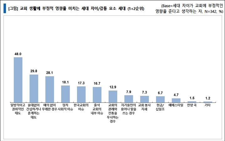교회 생활에 부정적 영향을 미치는 세대 차이/갈등 요소와 관련된 질문한 결과, '일반적이고 권위 적인 태도'가 48.0%로 가장 큰 요인으로 나타났다. 그 다음으로 '쓸데없이 간섭하거나 훈계하는 태도'(29.8%), '예의 없이 무례한 경우'(28.1%) 등 태도적 요인이 컸다.