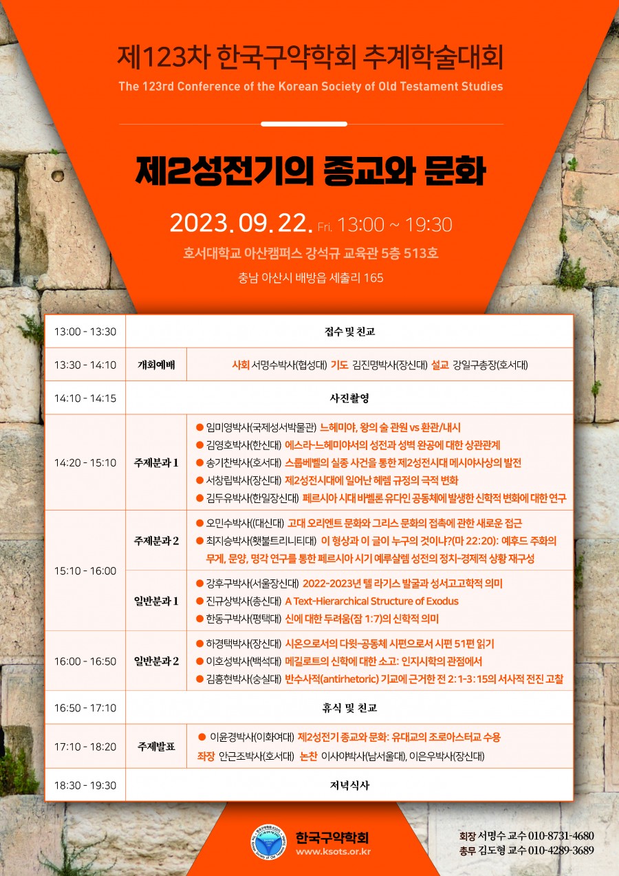 한국구약학회(회장:서명수 박사, 협성대 교수)가 오는 9월 22일 오후 1시 호서대 아산캠퍼스 강석규 교육관 5층 513호에서 '제123차 추계학술대회'를 개최한다.