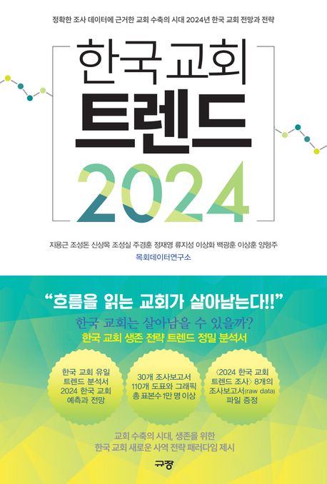 『한국교회 트렌드 2024』의 대표저자인 목회데이터연구소 지용근 대표는 “교회 수축 시대에 한국교회 목회자들이 교회와 세상을 입체적으로 보면서 시대의 흐름을 아는 혁신적인 리더가 되길 바란다”라며 “이 책이 2024년 목회 정책을 수립하는데 나침반 역할을 하기를 소망한다”라고 말한다.