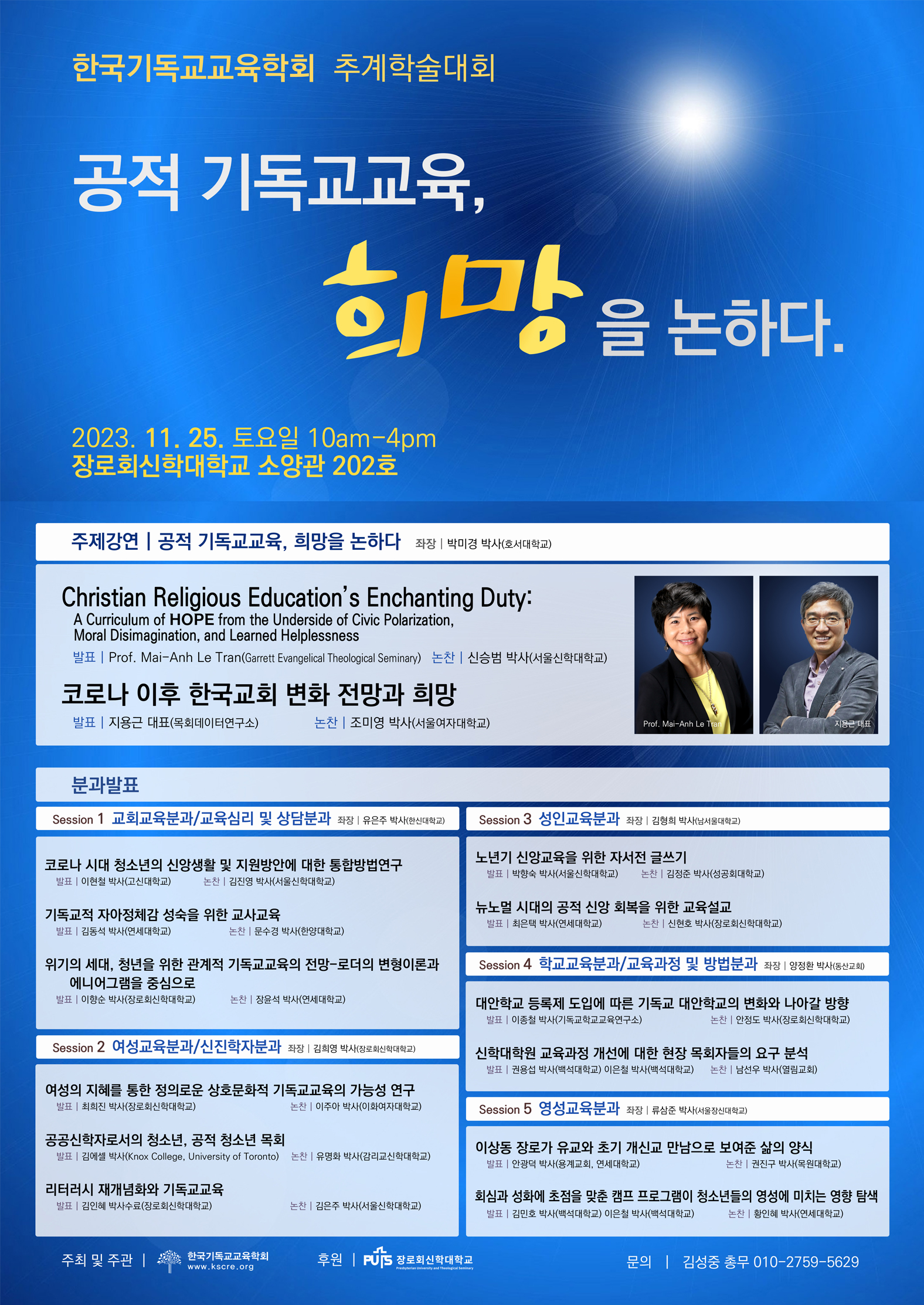 한국기독교교육학회(회장:김현숙 박사, 연세대 교수)가 오는 11월 25일(토) 오전 10시 장신대 소양관 202호실에서 <공적 기독교교육, 희망을 논하다>라는 주제로 추계학술대회를 개최한다.