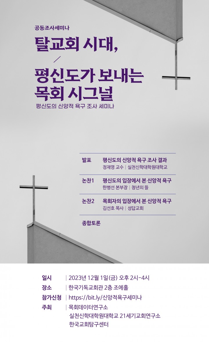 이날 실천신대 교수 정재영 박사가 설문조사 결과를 발표하며, 한병선 본부장(청년의뜰)과 김선호 목사(성답교회)가 평신도와 목회자의 입장에서 본 신앙적 욕구에 대해 논찬할 예정이다.