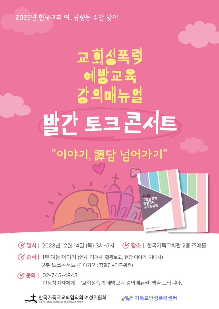 이와 관련 교회협 여성위원회는 오는 12월 14일(목) 오후 3시 한국기독교회관 2층 조에홀에서 <이야기, 譚 넘어가기>라는 주제로 교회성폭력 예방교육 강의매뉴얼 발간 토크콘서트를 개최한다.