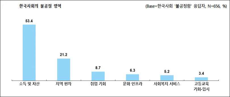 “오늘의 한국사회가 공정하다고 생각하십니까?”라고 질문한 결과, 응답자의 다수인 65.6%가 ‘그렇지 않다’고 답했고, 9.1%만이 ‘그렇다’고 답했다. 기독청년 대다수는 한국사회가 불공정하다고 보고 있었다. 특히 '불공정을 직접 경험해 보았는가'라는 질문에 응답자의 53.7%가 ‘그렇다’고 답했다.