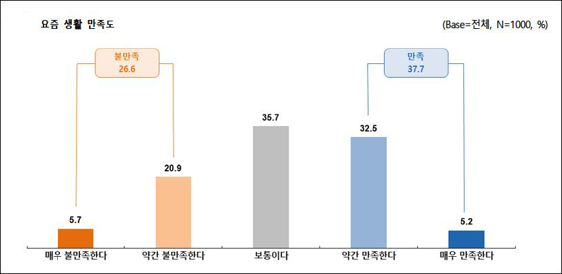 기독청년의 요즘 생활 만족도에 대해 알아본 결과, 전반적으로 ‘만족한다’고 응답했고, 35.7%는 ‘보통’, 26.6%는 ‘불만족스럽다’라고 응답했다. 전체 평점이 5점 척도에서 3.11점임을 감안할 때 대다수가 자기 삶에 평이한 수준으로 받아들이고 있었다.