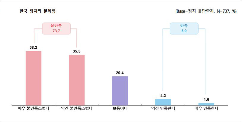 한국 정치 현실에 대한 만족도 조사 결과는 불만족이 73.7%로 높게 나타났고, 정치인에 대한 신뢰 정도에서도 불신이 76.6%로 매우 높게 나타났다. 또한 한국 정치가 청년의 삶의 질을 개선하고 있는가에 대한 물음에서도 70%가 부정적 인식을 표시했다.