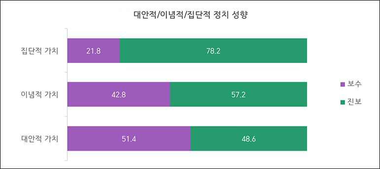 반면, ‘집단적 가치 유형’의 경우, 자신의 주관적 정치 성향보다 훨씬 진보적인 응답률을 보였다.
