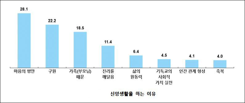 기독청년에게 신앙생활을 하는 이유에 대해 물은 결과, '마음의 평안'이 1순위, '구원'이 2순위, '가족 때문'이 3순위로 나타났다.