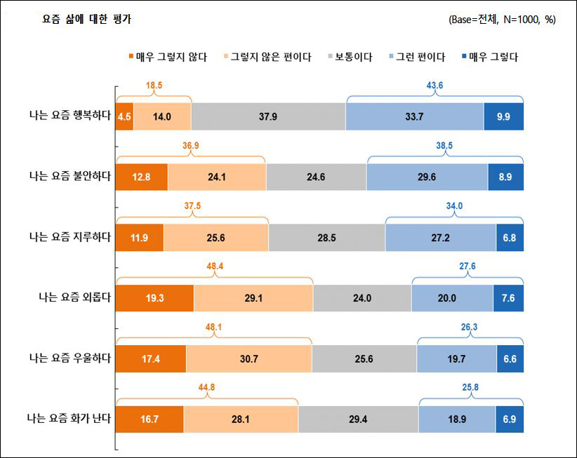 기독 청년에게 최근 느끼는 자신의 삶에 대해 물은 결과, ‘행복하다’에 대한 동의율(그런 편이다+매우 그렇다)이 43.6%로 상대적으로 가장 높았다. 반면, ‘불안감’ 38.5%, ‘지루함’ 34.0%, ‘외로움’ 27.6%, ‘우울감’ 26.3%, ‘화남’ 25.8% 등의 순으로도 응답했다.