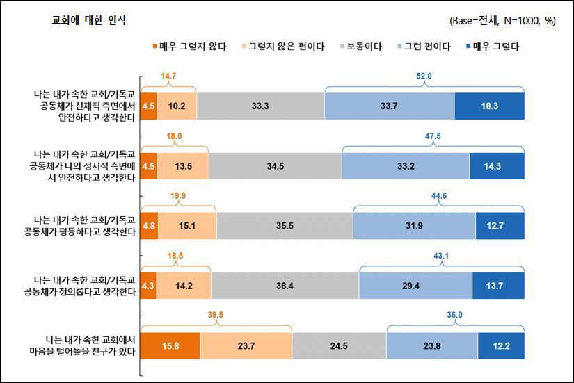 기독청년들에게 교회와 사회에 대한 인식과 관련된 질문을 한 결과, 교회는 2명 중 1명이 안전하다고 말할 정도로 비교적 안전한 공동체이고, 10명 중 4명은 평등하고 정의로운 공동체라고 생각하고 있었다.